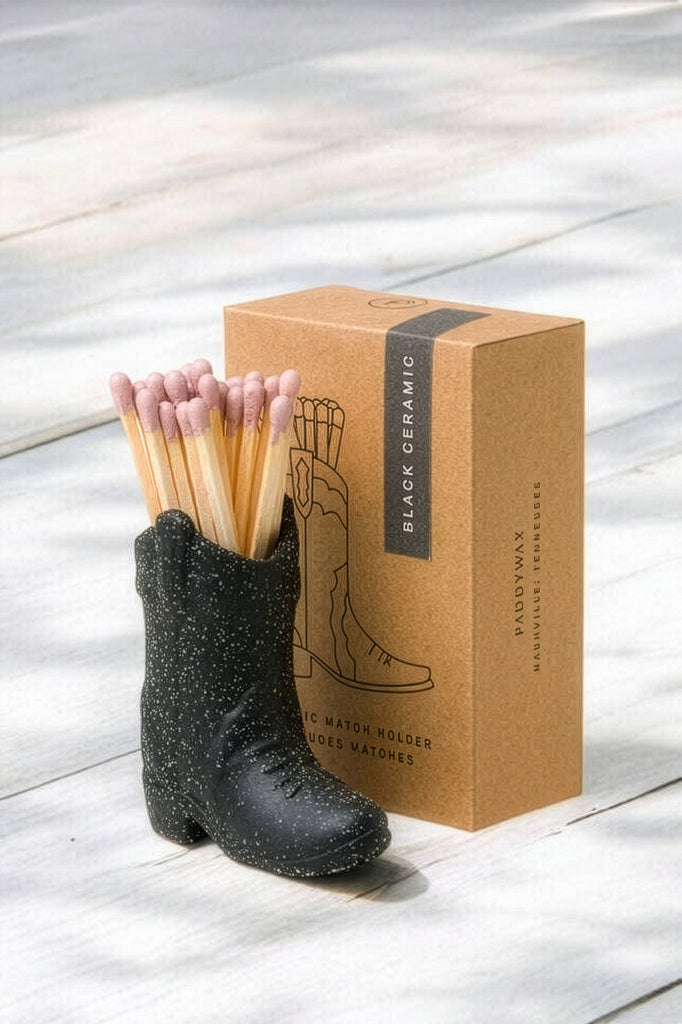 Ceramic cowboy boot match holder includes 25 safety matches that are easily lit with a strike on the bottom of the boot! After the matches run out, this holder is compatible with any match and can provide light by striking on the rough ceramic surface. Whether you are daydreaming about Texas or wanting a Western vibe, these ceramic boot and hat accessories make the perfect gift set or bookshelf accessory.