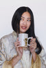 Food, dishwasher, and microwave safe. It measures approximately 3 1/4 inches wide and 4 3/4 inches high. Each mug is handmade and will vary from one to the next. No 2 pieces will be exactly the same. Colors may vary slightly.