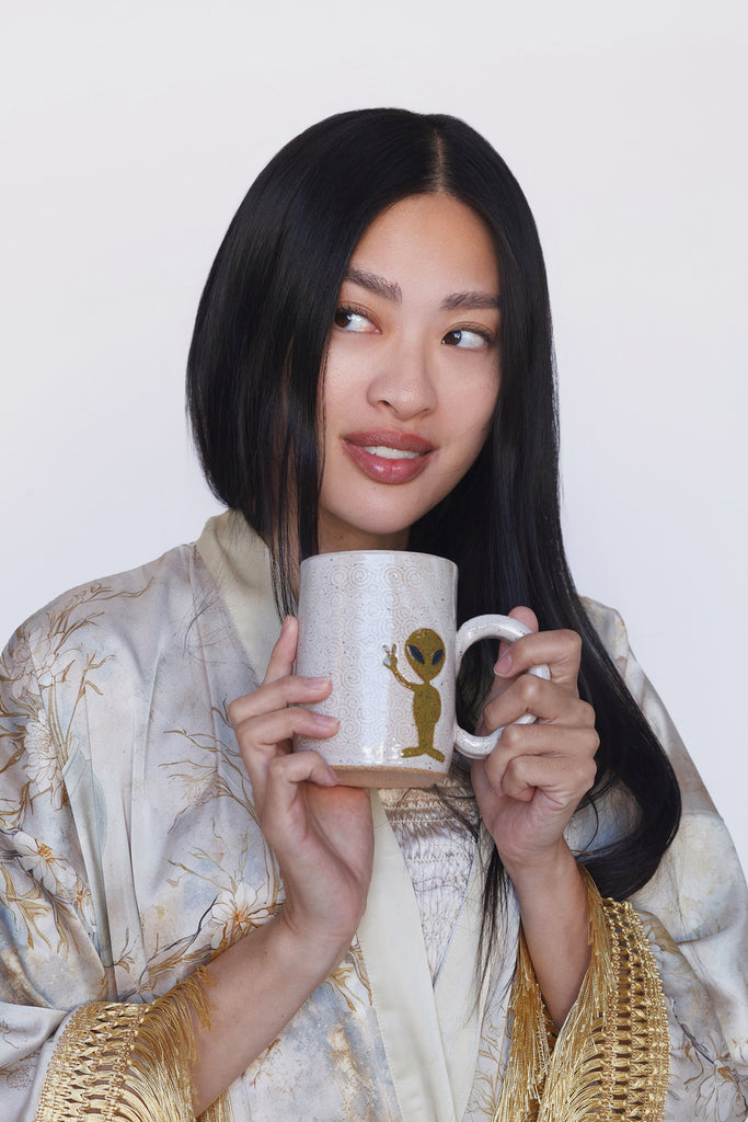 This beautiful stoneware ceramic alien design mug, approximately 16 oz., is hand-built and hand-glazed in Ohio, USA.